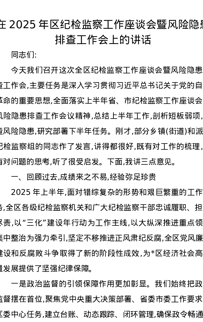 在2025年区纪检监察工作座谈会暨风险隐患排查工作会上的讲话