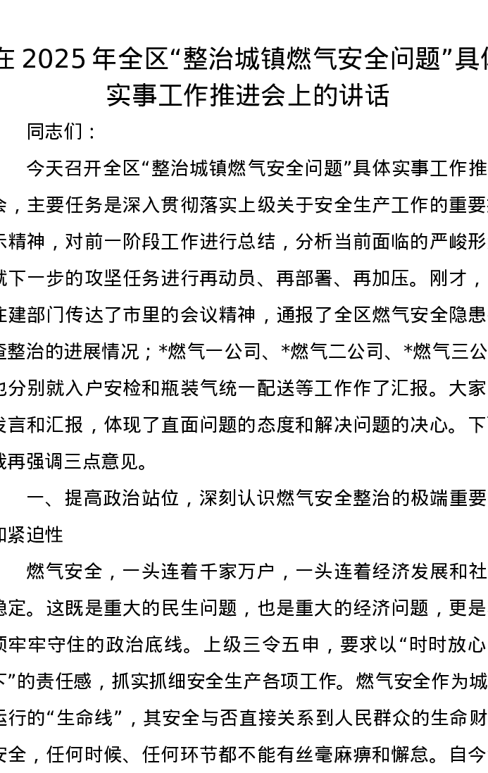 在2025年全区“整治城镇燃气安全问题”具体实事工作推进会上的讲话