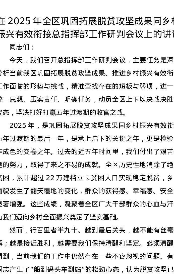 在2025年全区巩固拓展脱贫攻坚成果同乡村振兴有效衔接总指挥部工作研判会议上的讲话