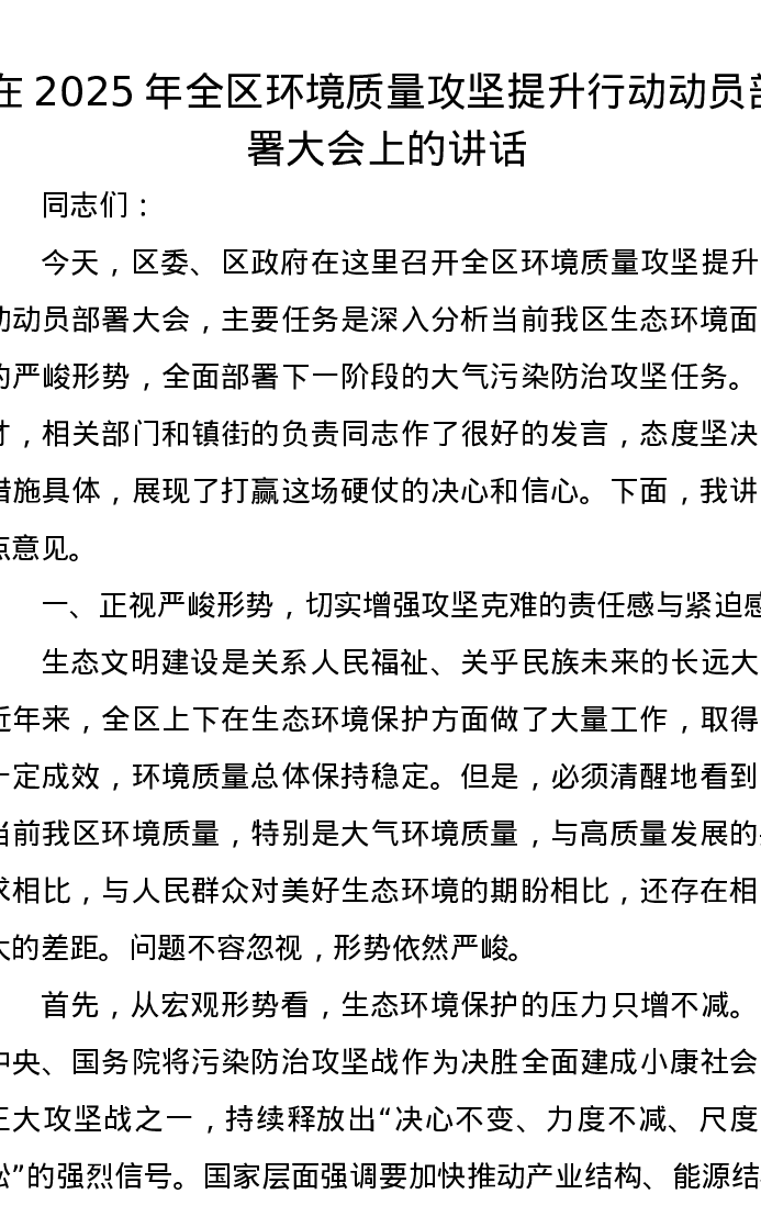 在2025年全区环境质量攻坚提升行动动员部署大会上的讲话