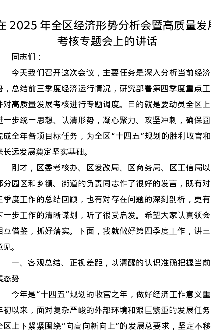 在2025年全区经济形势分析会暨高质量发展考核专题会上的讲话