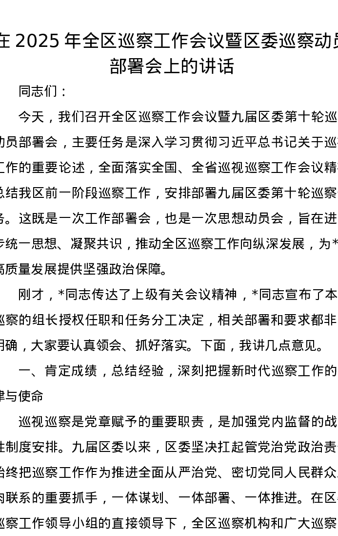 在2025年全区巡察工作会议暨区委巡察动员部署会上的讲话