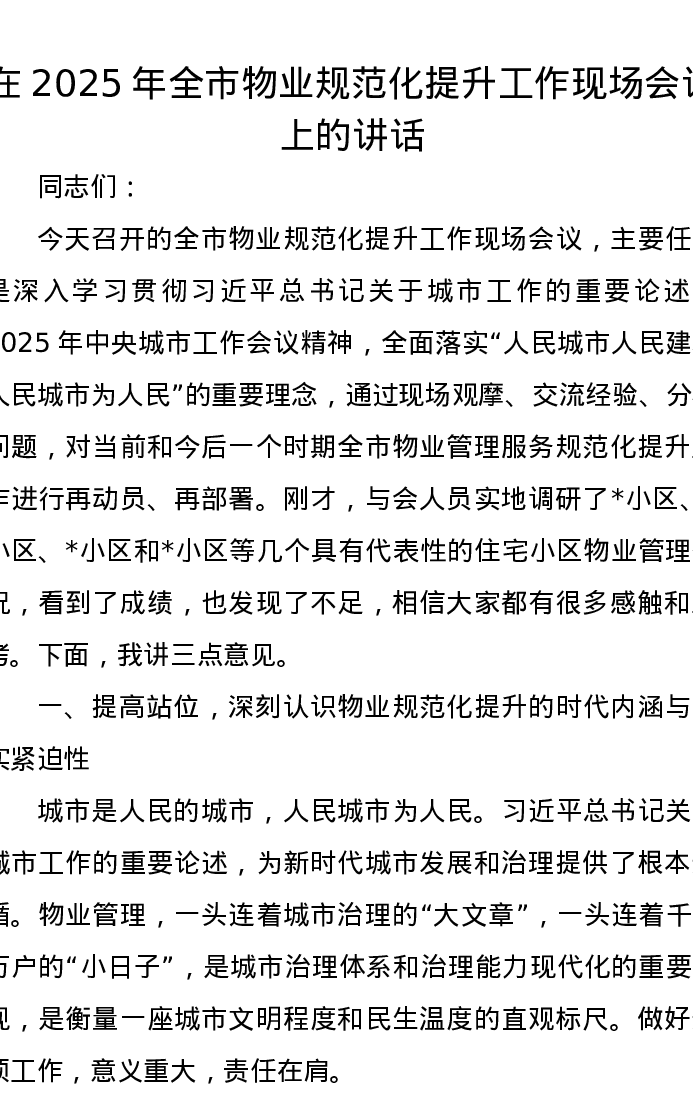 在2025年全市物业规范化提升工作现场会议上的讲话