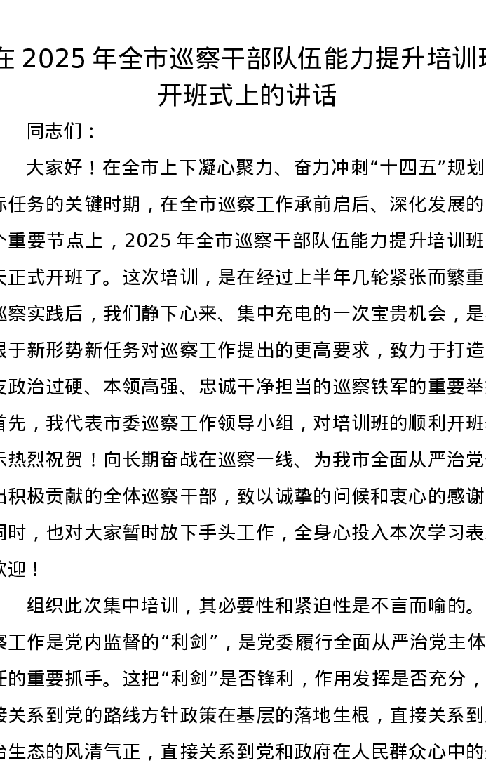 在2025年全市巡察干部队伍能力提升培训班开班式上的讲话