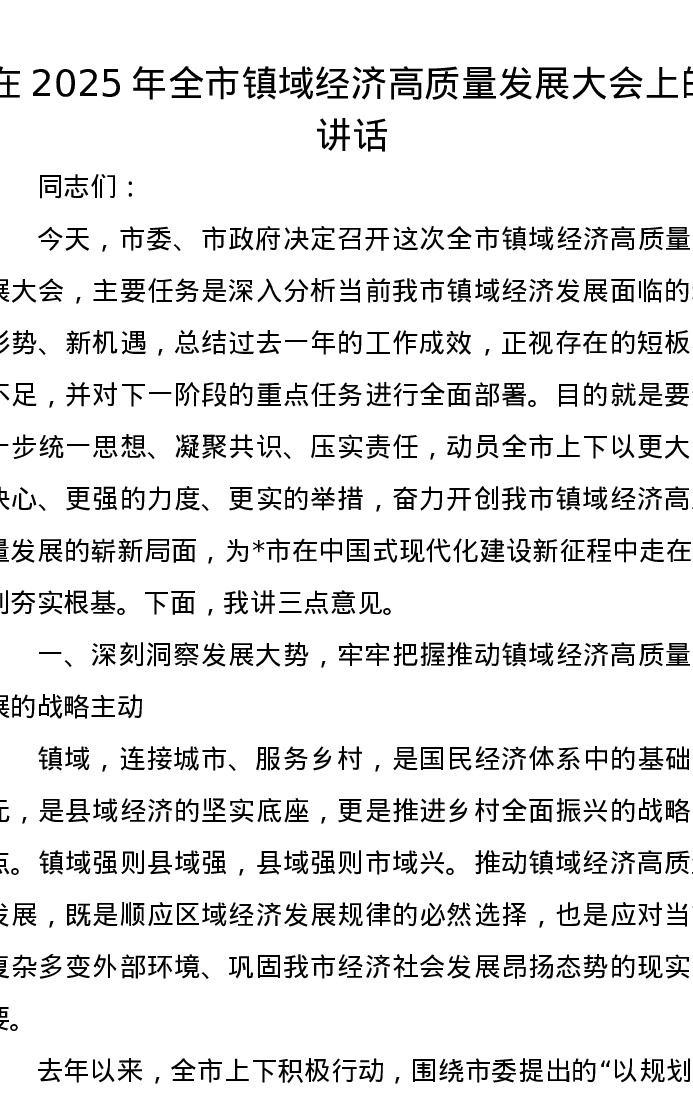 在2025年全市镇域经济高质量发展大会上的讲话
