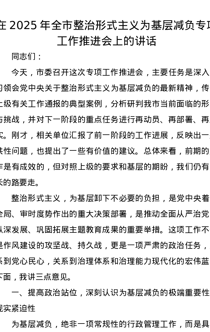 在2025年全市整治形式主义为基层减负专项工作推进会上的讲话
