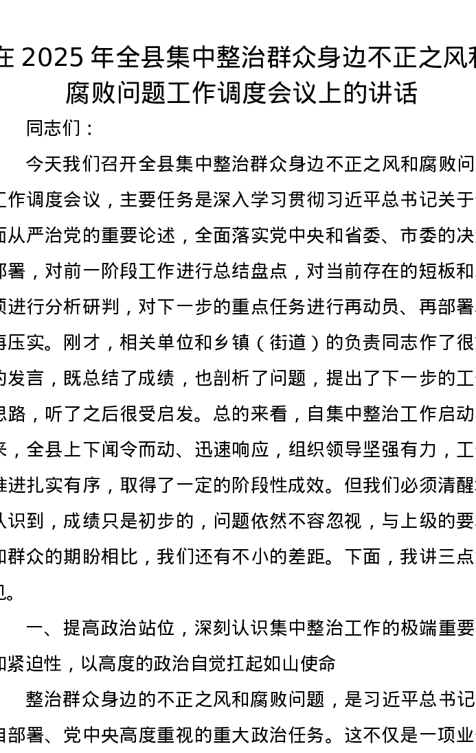 在2025年全县集中整治群众身边不正之风和腐败问题工作调度会议上的讲话