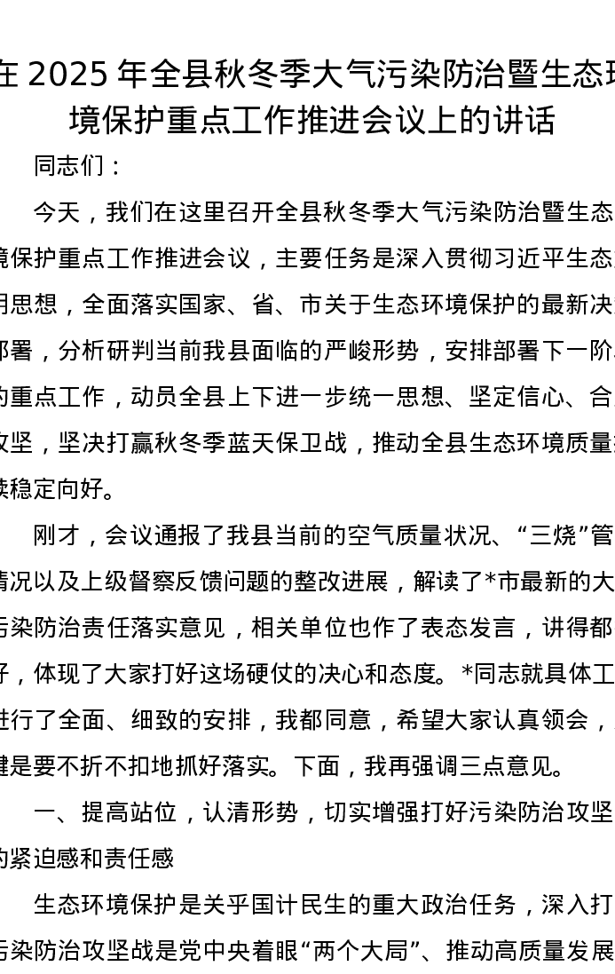 在2025年全县秋冬季大气污染防治暨生态环境保护重点工作推进会议上的讲话