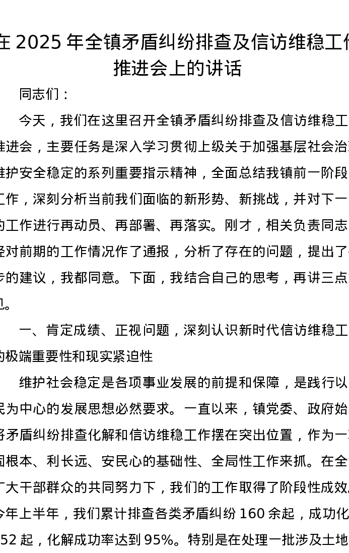 在2025年全镇矛盾纠纷排查及信访维稳工作推进会上的讲话