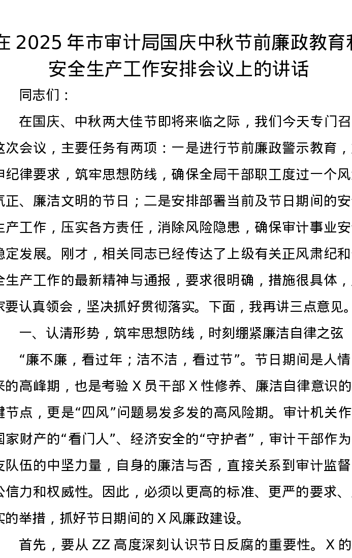 在2025年市审计局国庆中秋节前廉政教育和安全生产工作安排会议上的讲话
