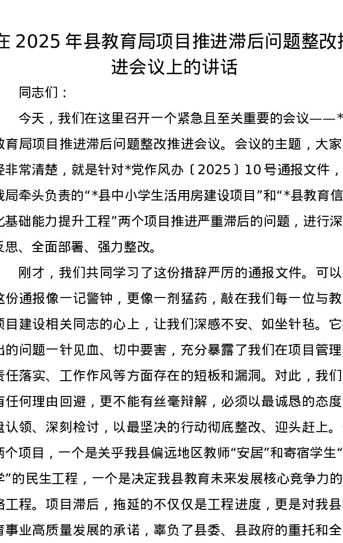 在2025年县教育局项目推进滞后问题整改推进会议上的讲话