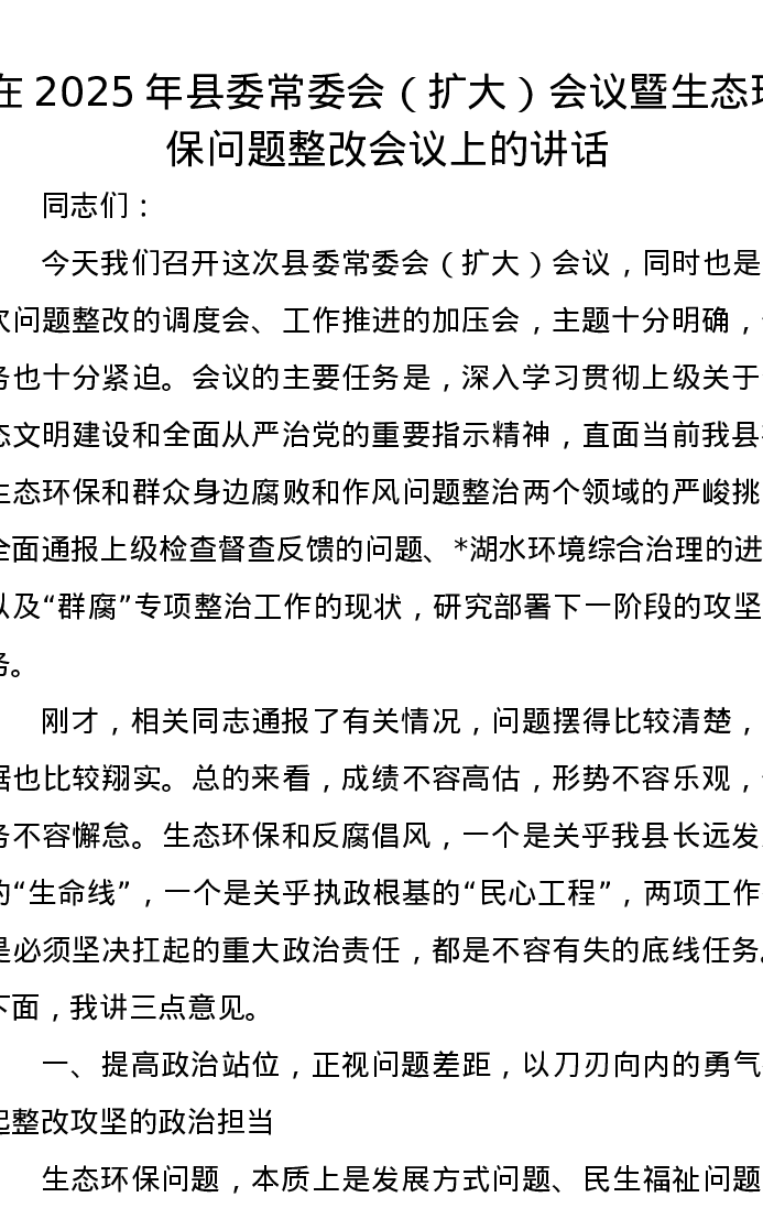 在2025年县委常委会(扩大)会议暨生态环保问题整改会议上的讲话