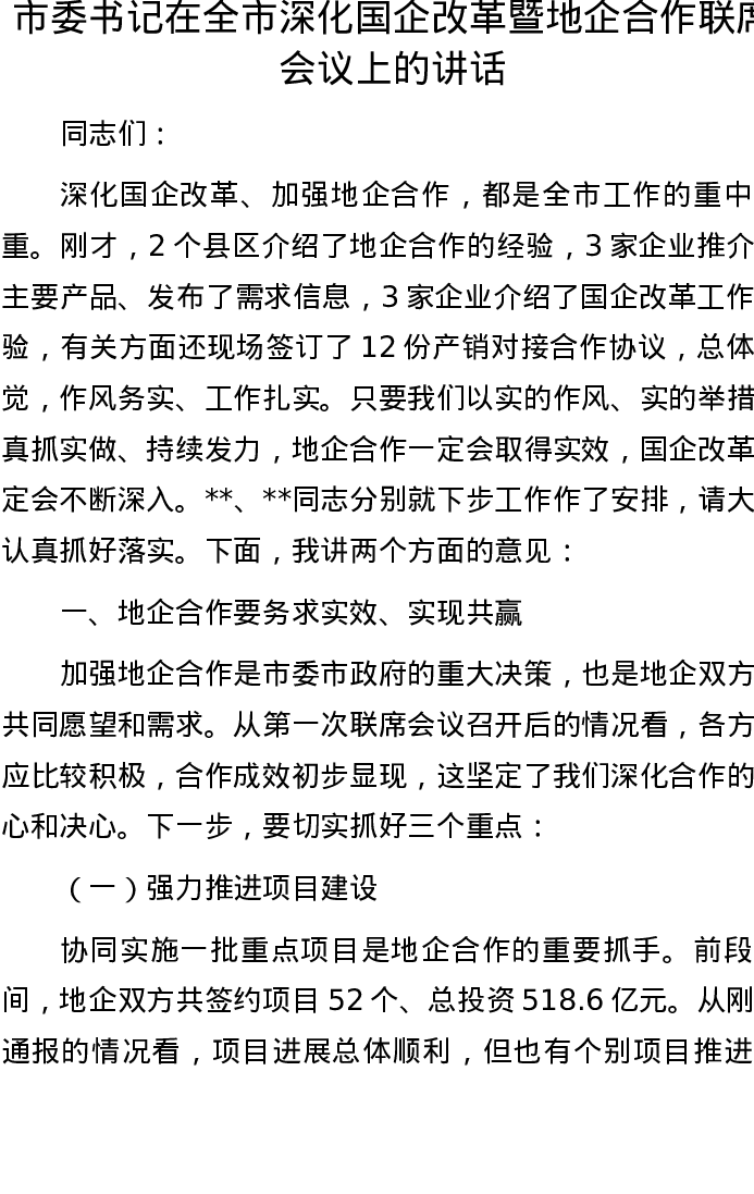20220904市委书记在全市深化国企改革暨地企合作联席会议上的讲话