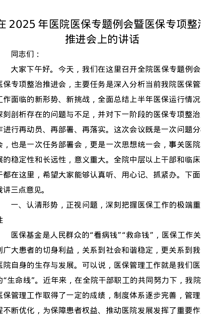 在2025年医院医保专题例会暨医保专项整治推进会上的讲话
