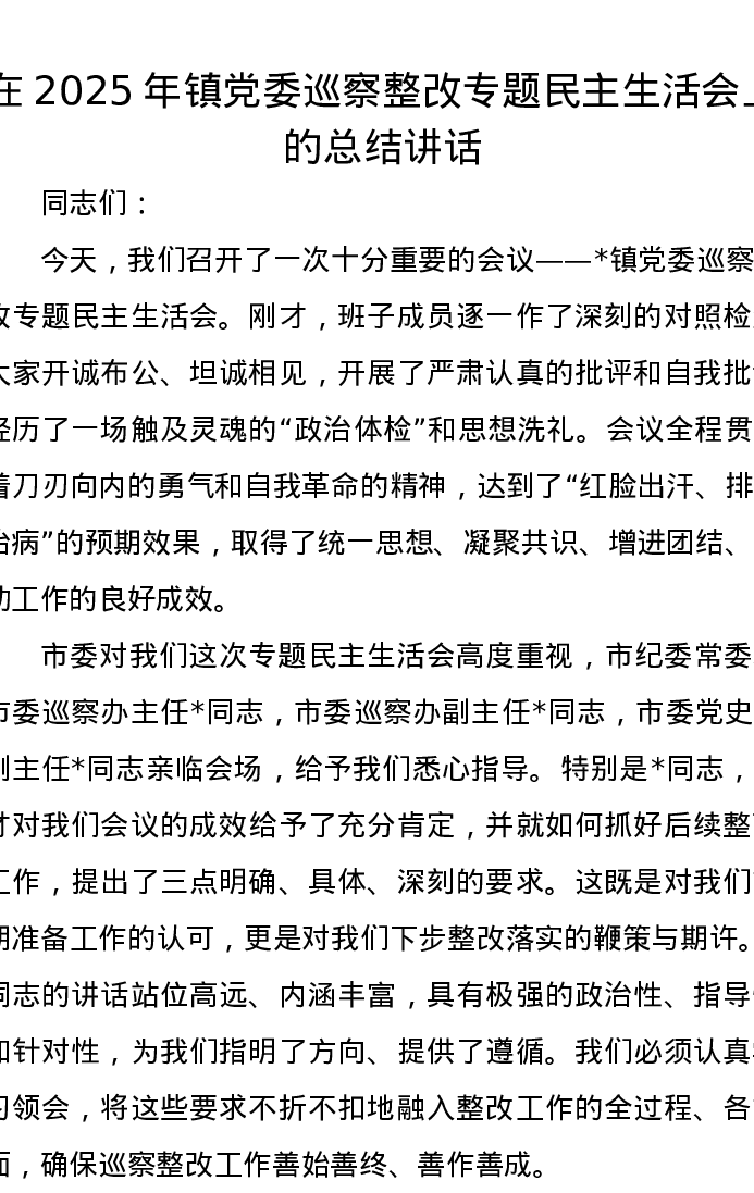 在2025年镇党委巡察整改专题民主生活会上的总结讲话