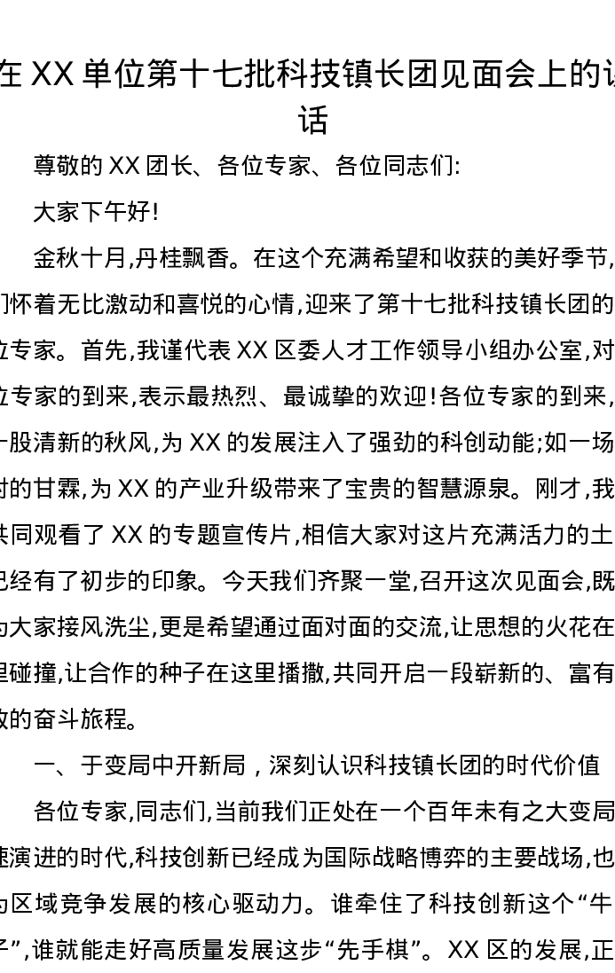 在XX单位第十七批科技镇长团见面会上的讲话