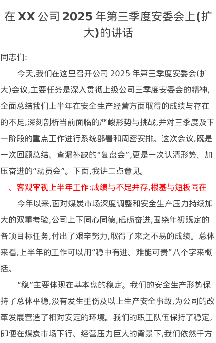 在XX公司2025年第三季度安委会上(扩大)的讲话