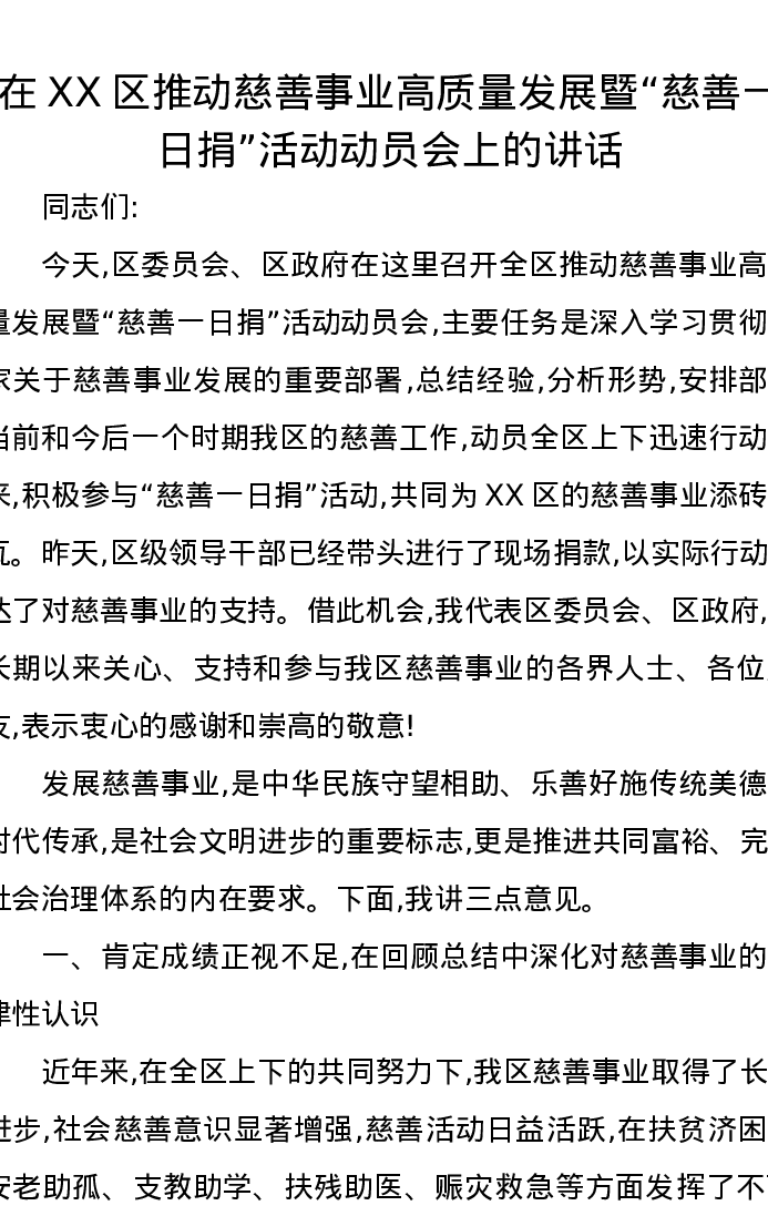 在XX区推动慈善事业高质量发展暨“慈善一日捐”活动动员会上的讲话