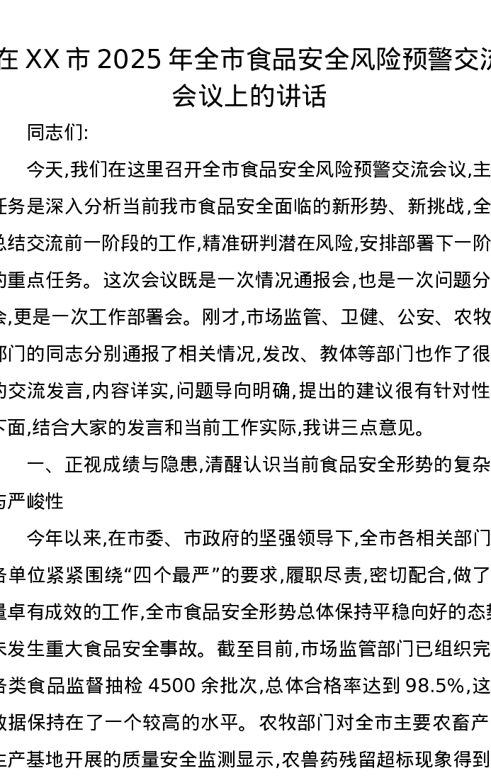 在XX市2025年全市食品安全风险预警交流会议上的讲话