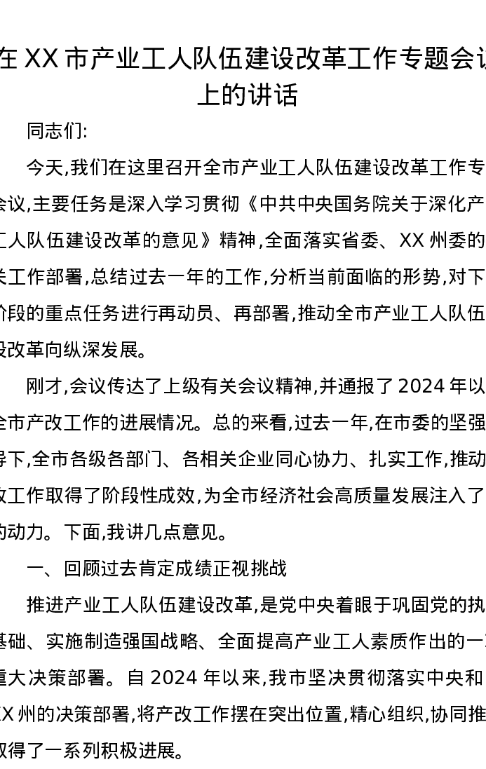 在XX市产业工人队伍建设改革工作专题会议上的讲话