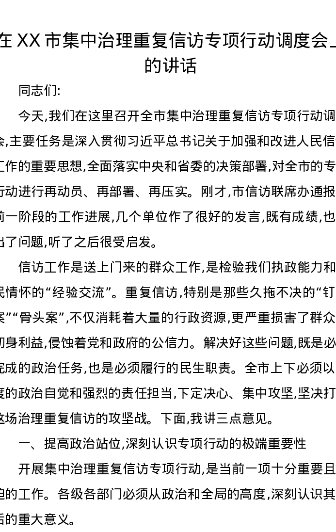 在XX市集中治理重复信访专项行动调度会上的讲话
