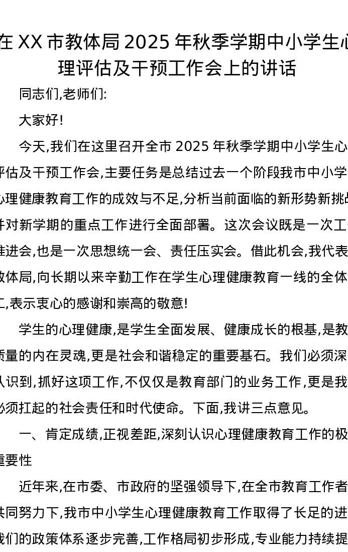 在XX市教体局2025年秋季学期中小学生心理评估及干预工作会上的讲话