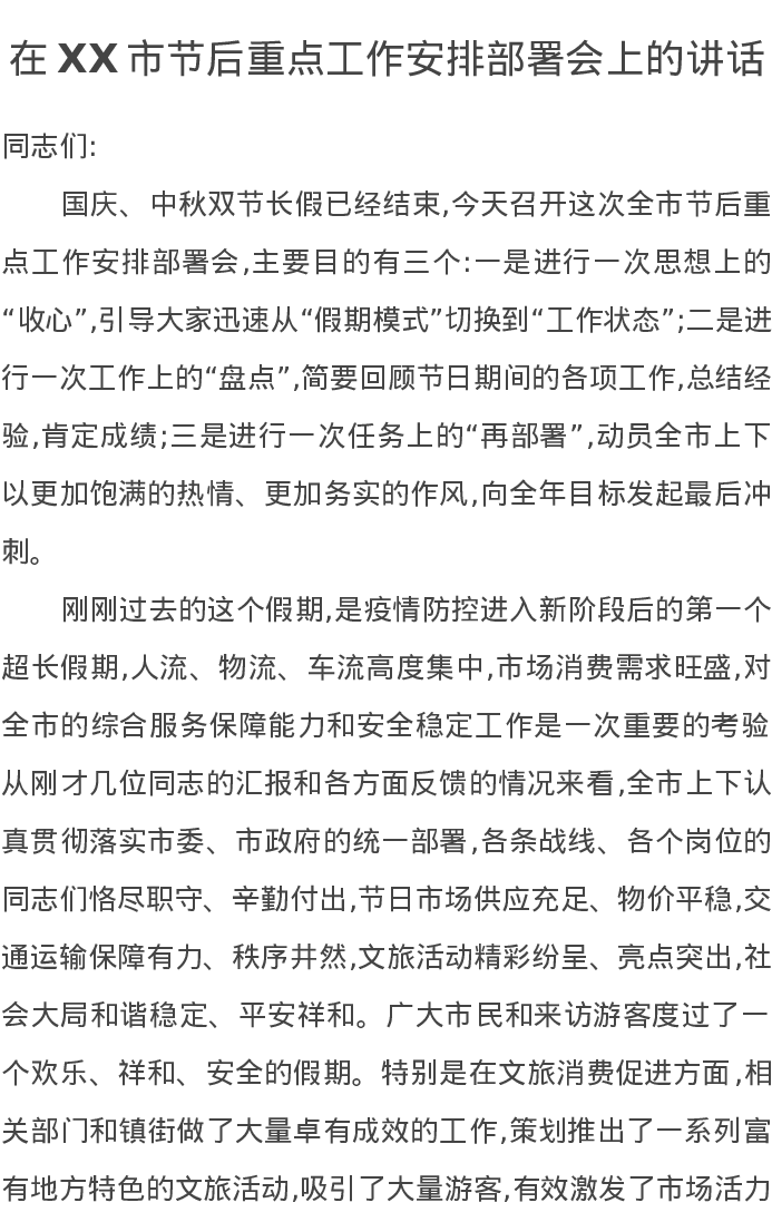 在XX市节后重点工作安排部署会上的讲话