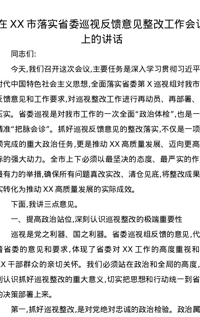 在XX市落实省委巡视反馈意见整改工作会议上的讲话