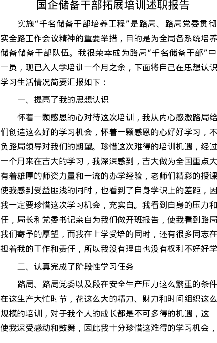 20220906国企储备干部拓展培训述职报告