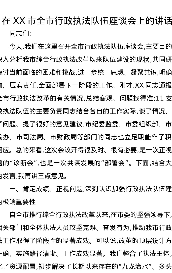 在XX市全市行政执法队伍座谈会上的讲话