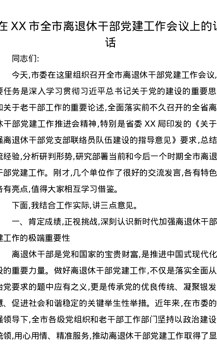 在XX市全市离退休干部党建工作会议上的讲话