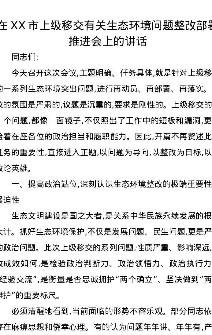 在XX市上级移交有关生态环境问题整改部署推进会上的讲话