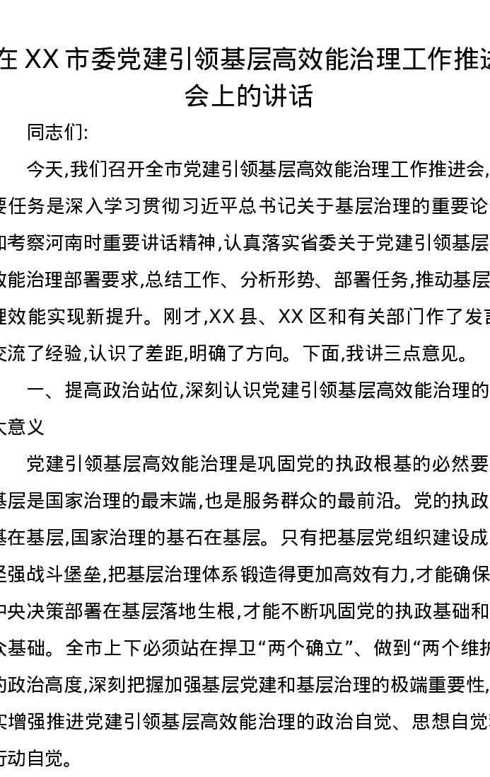 在XX市委党建引领基层高效能治理工作推进会上的讲话