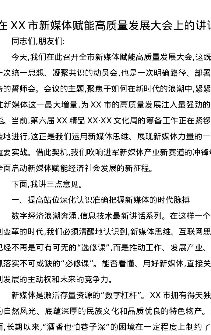 在XX市新媒体赋能高质量发展大会上的讲话