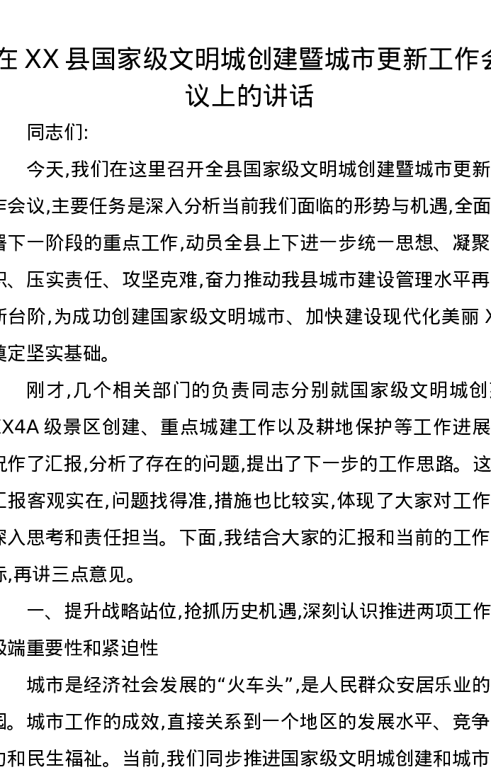 在XX县国家级文明城创建暨城市更新工作会议上的讲话