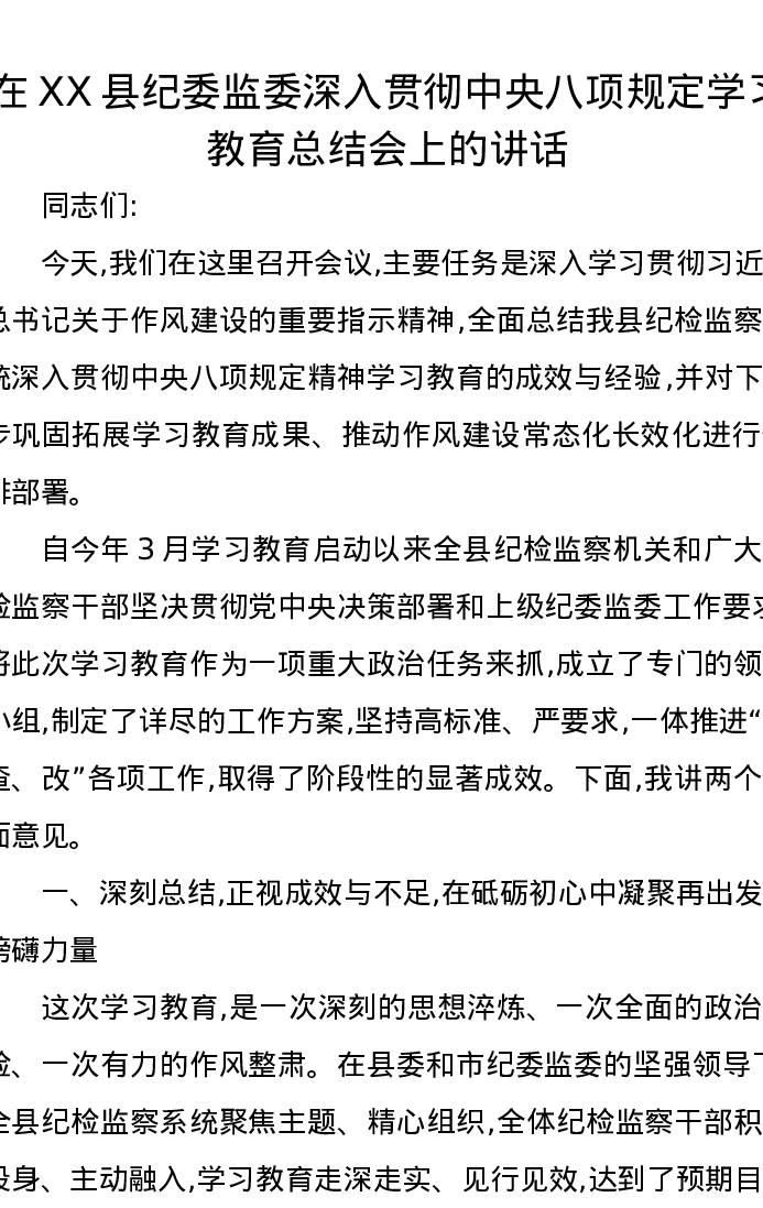 在XX县纪委监委深入贯彻中央八项规定学习教育总结会上的讲话