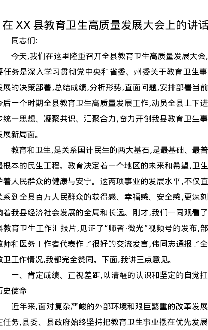 在XX县教育卫生高质量发展大会上的讲话