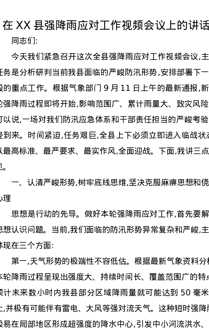 在XX县强降雨应对工作视频会议上的讲话