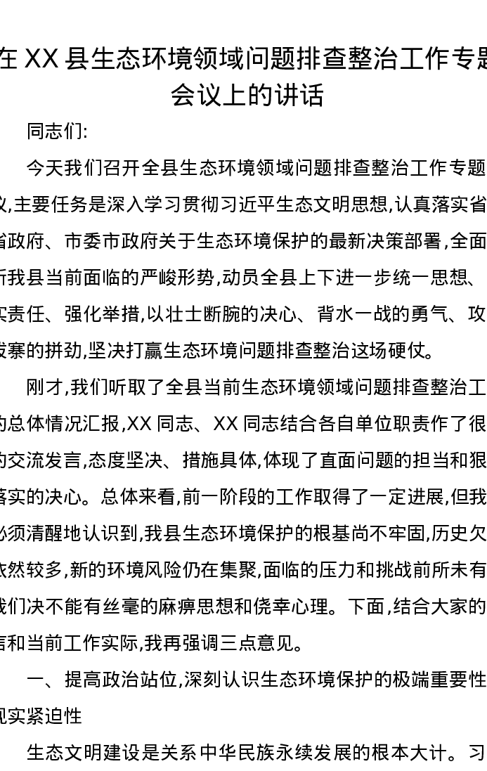 在XX县生态环境领域问题排查整治工作专题会议上的讲话