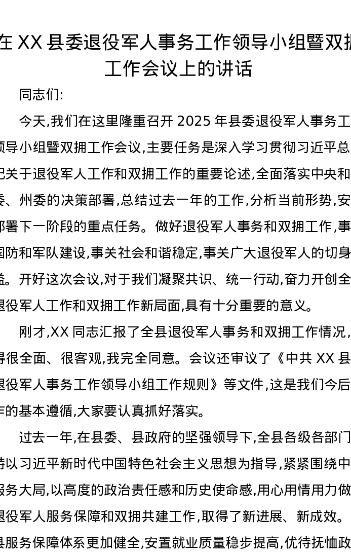 在XX县委退役军人事务工作领导小组暨双拥工作会议上的讲话