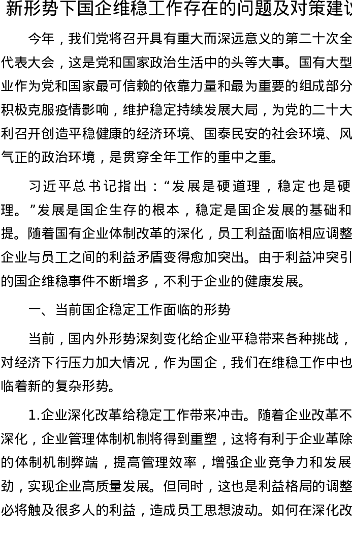 20220914新形势下国企维稳工作存在的问题及对策建议