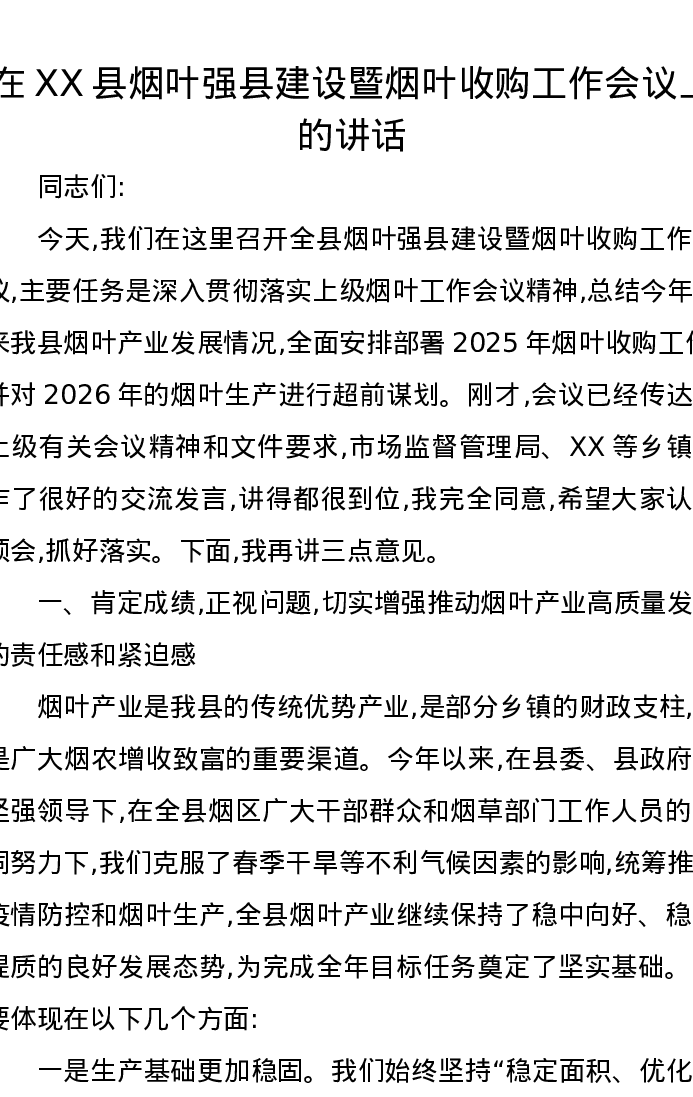 在XX县烟叶强县建设暨烟叶收购工作会议上的讲话