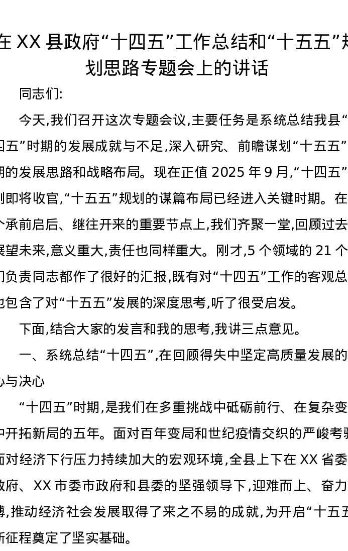 在XX县政府“十四五”工作总结和“十五五”规划思路专题会上的讲话