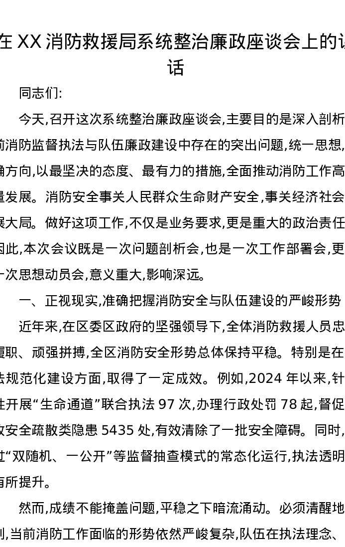 在XX消防救援局系统整治廉政座谈会上的讲话