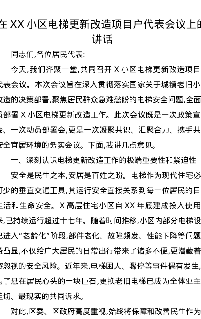在XX小区电梯更新改造项目户代表会议上的讲话