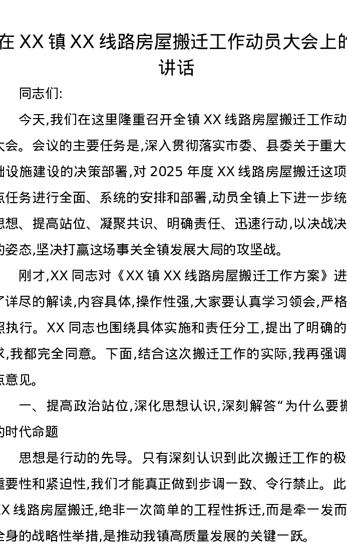 在XX镇XX线路房屋搬迁工作动员大会上的讲话