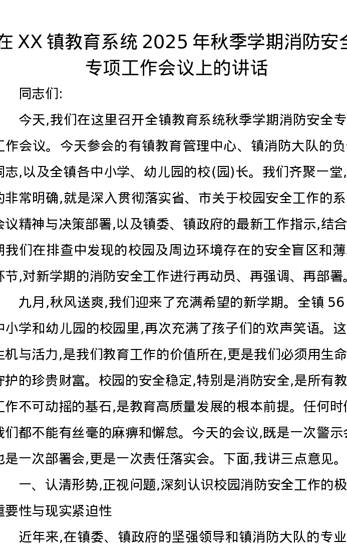 在XX镇教育系统2025年秋季学期消防安全专项工作会议上的讲话