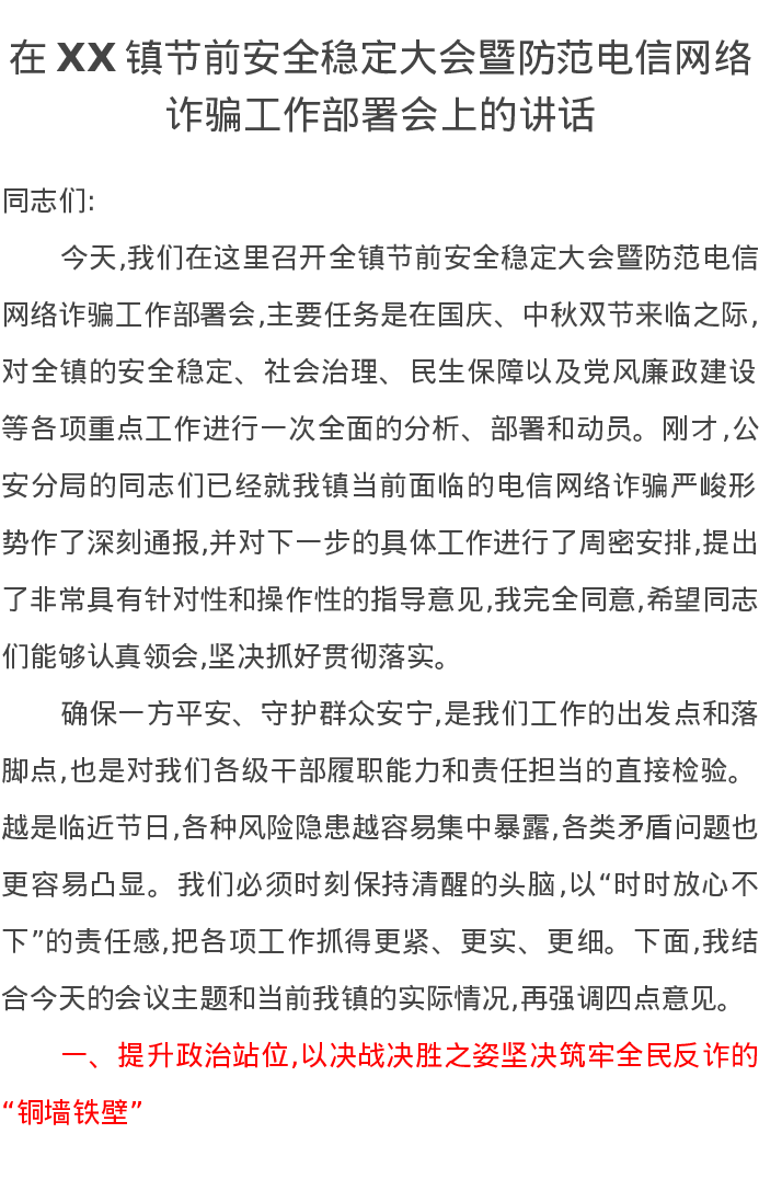 在XX镇节前安全稳定大会暨防范电信网络诈骗工作部署会上的讲话