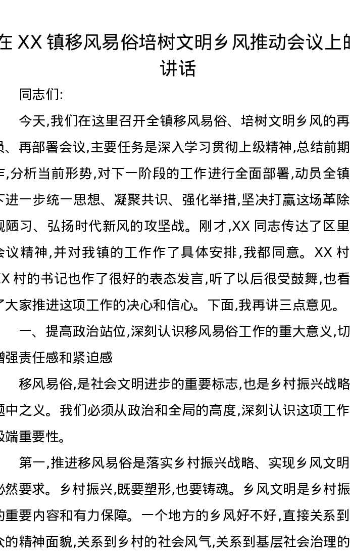 在XX镇移风易俗培树文明乡风推动会议上的讲话