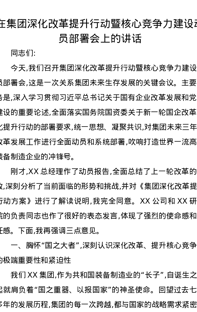 在集团深化改革提升行动暨核心竞争力建设动员部署会上的讲话